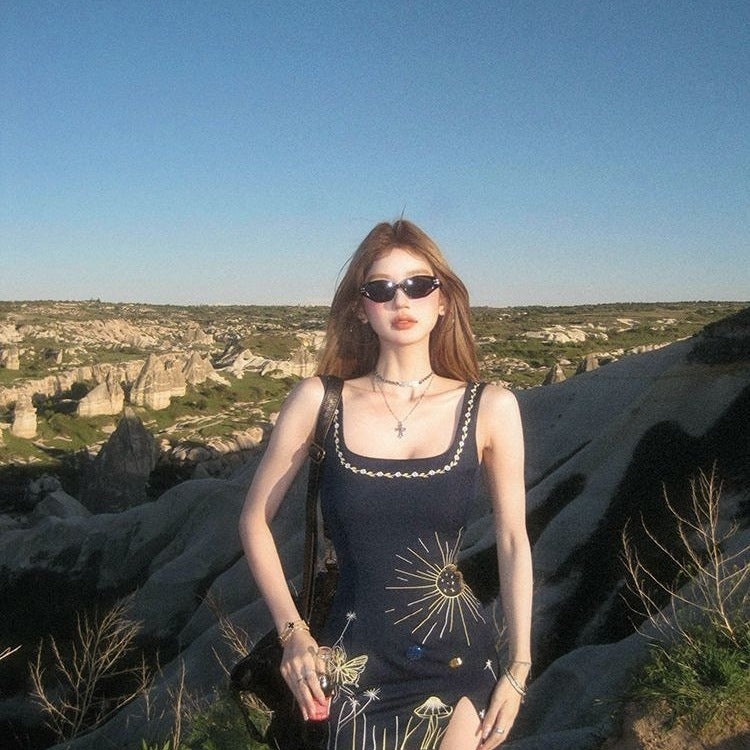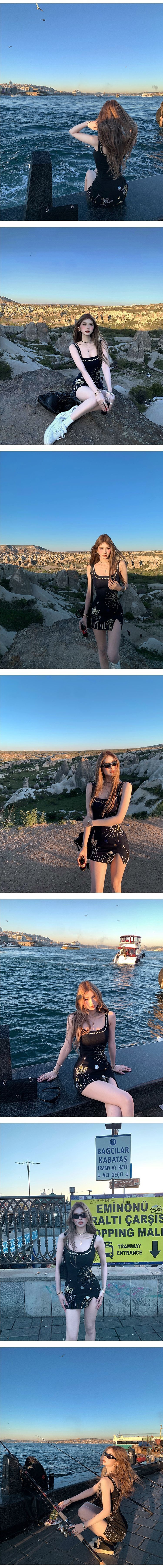 Retro Art Style Suspender Dress – Short Sleeve Polyester Mini Dress